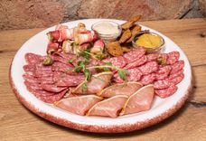 400/100 г • Плато из разнообразных мясных деликатесов. Подаётся с хлебными гренками, горчицей, хреном