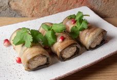 150 г • Рулетики из баклажанов с начинкой из грецких орехов с добавлением чеснока, аджики, кинзы и специй