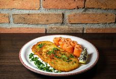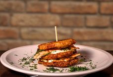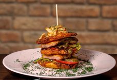 330 г • куриное филе, драники, салат, сыр, томат, огурец маринованный, соус чесночный