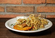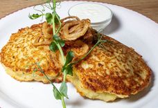 330 г • свиная шея, драники, салат, сыр, томат, огурец маринованный, соус барбекю