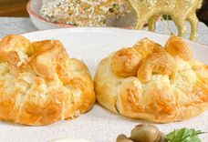 250/50 г • Горячие мешочки из слоёного теста с начинкой из филе цыпленка, грибов, сулугуни и зелени. Подаётся со сметаной.