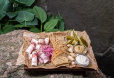225/30/30 г • Сало, маринованные огурцы, маринованный чеснок, маринованный красный лук, хлебушек, хрен, горчица