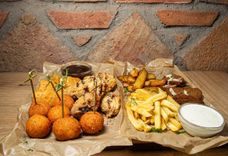 750/50/50 г • Сырные шарики, наггетсы, картофель по-деревенски, сухарики, картофель фри, куриные крылышки в панировке, соус барбекю, соус чесночный